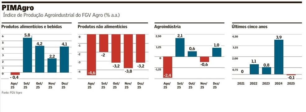 A produção da agroindústria brasileira encerrou 2025 praticamente estável, com leve retração de 0,1%, conforme o Índice de Produção Agroindustrial (PIMAgro), elaborado pelo Fundação Getulio Vargas (FGV Agro). O resultado reflete o equilíbrio entre juros elevados e o mercado interno aquecido ao longo do ano.