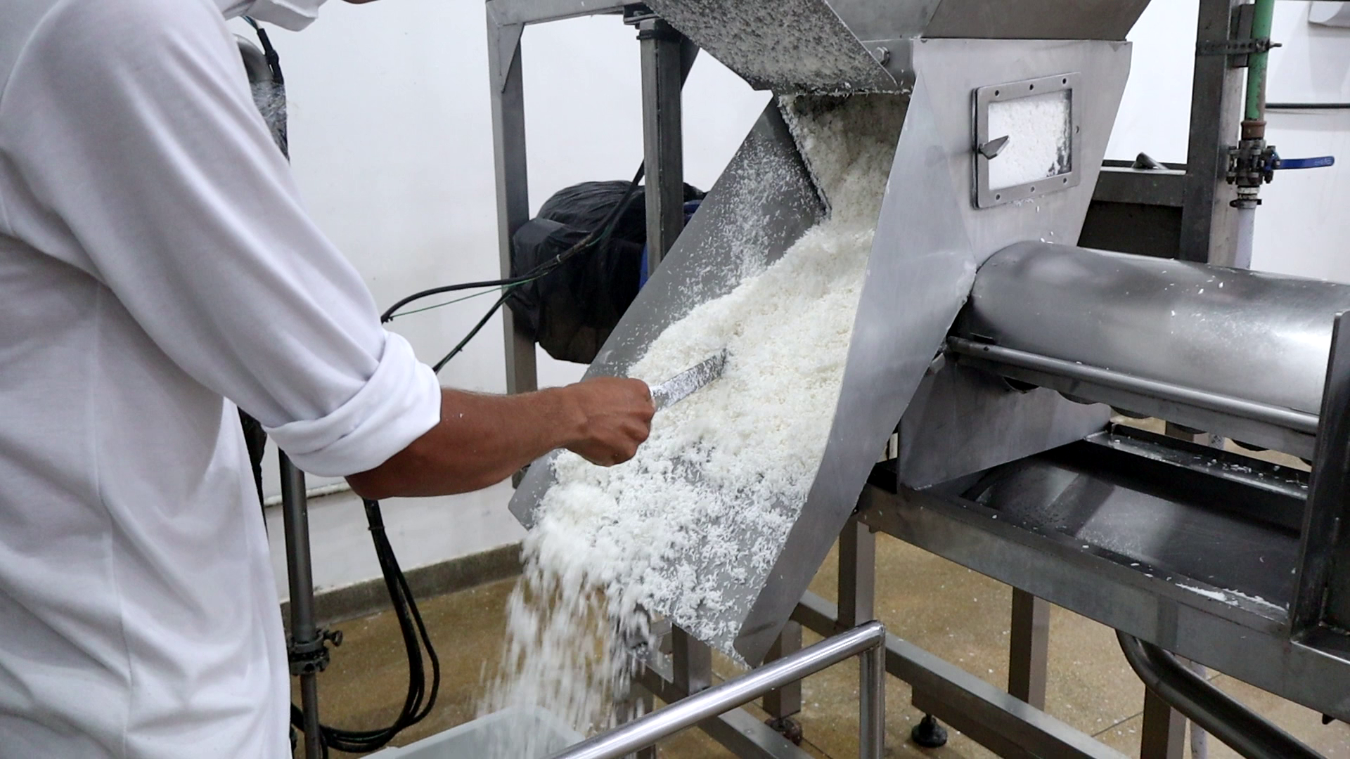 Segundo Dantas, o coco chega do campo à unidade industrial já descascado. “Aqui, ele é pesado em um processo que é conferido pelo agricultor. Em seguida, o coco é colocado em uma estrutura para ser direcionado ao processo de cozimento, semelhante ao de uma panela de pressão. Com isso, as pessoas que fazem a ‘quebragem’ recebem os cocos pré-cozidos para que a polpa do fruto possa sair com mais facilidade”, declarou ele, afirmando que o coco beneficiado na fábrica tem origem em plantações existentes nos municípios da região, a exemplo de Porto de Pedras e São Miguel dos Milagres.