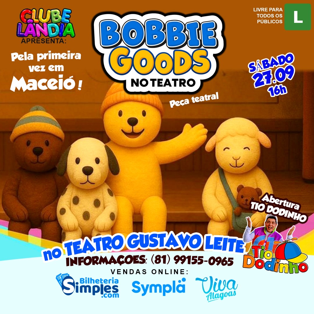 Uma aventura mágica vai invadir Maceió! "Ô mãe, compra Bobbie Goods!!" O Teatro Gustavo Leite recebe o espetáculo Bobbie Goods – O Musical, que promete encantar a criançada com muita cor, música e imaginação. Garanta já seu ingresso e mergulhe nesse mundo encantado com Bobbie, Momo, Kickflip e Beanbag!