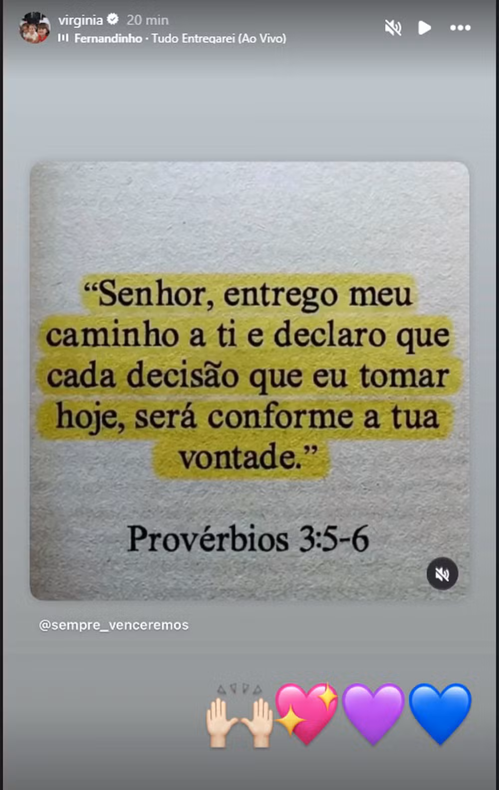 Em uma publicação, Virginia citou Provérbios 3:5-6, que diz: "Senhor, entrego meu caminho a ti e declaro que cada decisão que eu tomar hoje será conforme a tua vontade". A influenciadora também compartilhou o louvor "Tudo Entregarei", de Fernandinho, reforçando a mensagem de fé e confiança nas decisões divinas.
