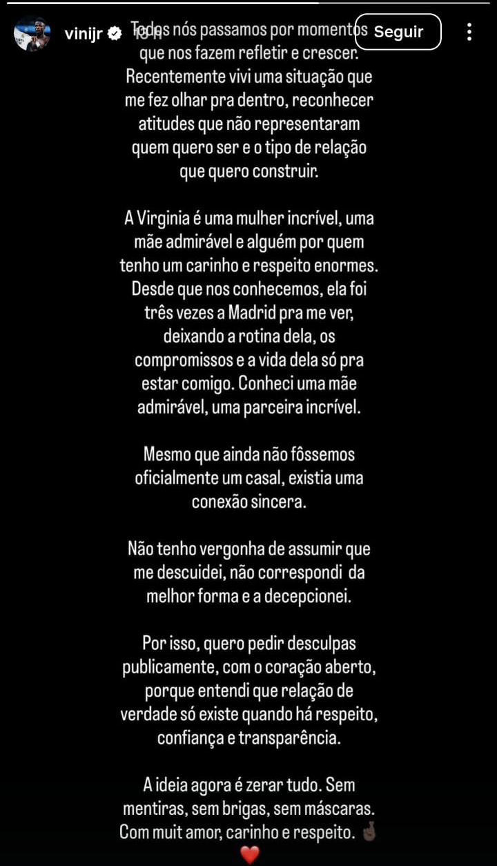 A postagem de Virginia aconteceu poucos minutos após Vini Jr. romper o silêncio sobre o término de seu suposto relacionamento com a influenciadora, o que gerou grande repercussão nas redes sociais. O jogador do Real Madrid pediu desculpas publicamente a Virginia após a divulgação de conversas privadas entre ele e outra mulher, que surgiram no contexto de rumores sobre um romance entre os dois.
