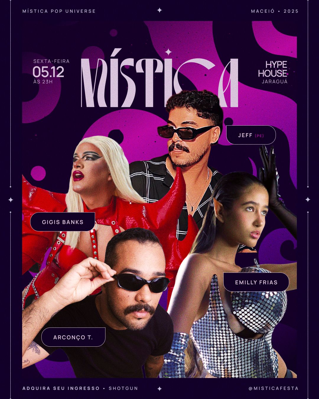 Inspirada em estéticas mágicas e universos lúdicos, a MÍSTICA cria um ambiente em que futurismo, nostalgia e referências alternativas se encontram na pista. É uma celebração para quem vive a noite com intensidade, criatividade e expressão, um lugar onde o pop ganha novas camadas e se reinventa em forma, som e brilho.