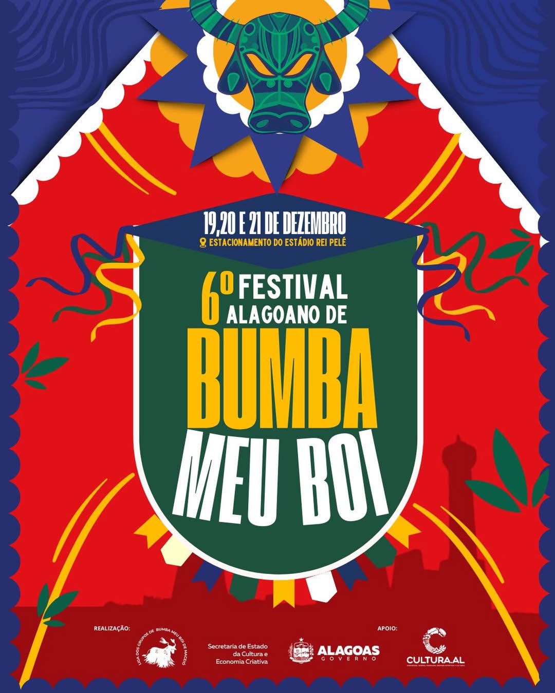 A Liga de Bumba Meu Boi de Alagoas, em parceria com a Secretaria de Estado da Cultura e Economia Criativa (Secult), divulgou a programação oficial do 6º Festival Alagoano de Bumba Meu Boi. O evento será realizado entre os dias 19 e 21 de dezembro, a partir das 18h, no estacionamento do Estádio Rei Pelé, no bairro do Trapiche, em Maceió.
