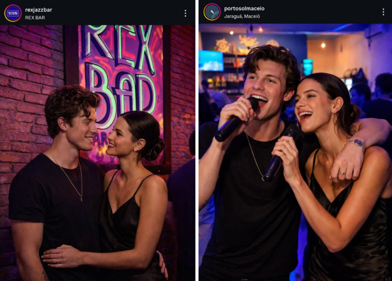 Outros dois perfis, de empresas alagoanas, utilizaram a ferramenta para criar imagens do casal curtindo os bares da capital. As páginas do Rex Jazz Bar e do Porto Sol publicaram imagens de IA com Bruna e Shawn curtindo a noite de Maceió.