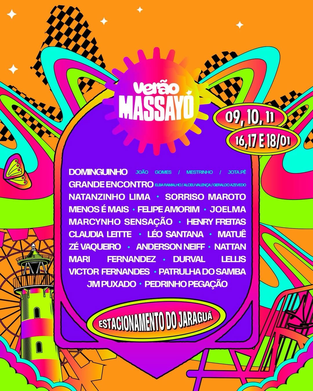 Nesta quinta-feira (1º), foi anunciado o Verão Massayó, festival que será realizado em dois finais de semana do mês de janeiro, no estacionamento do Jaraguá. Nos dias 9, 10, 11 e 16, 17 e 18, o público formado por maceioenses e turistas poderá curtir uma programação diversa, com atrações musicais para todos os gostos.