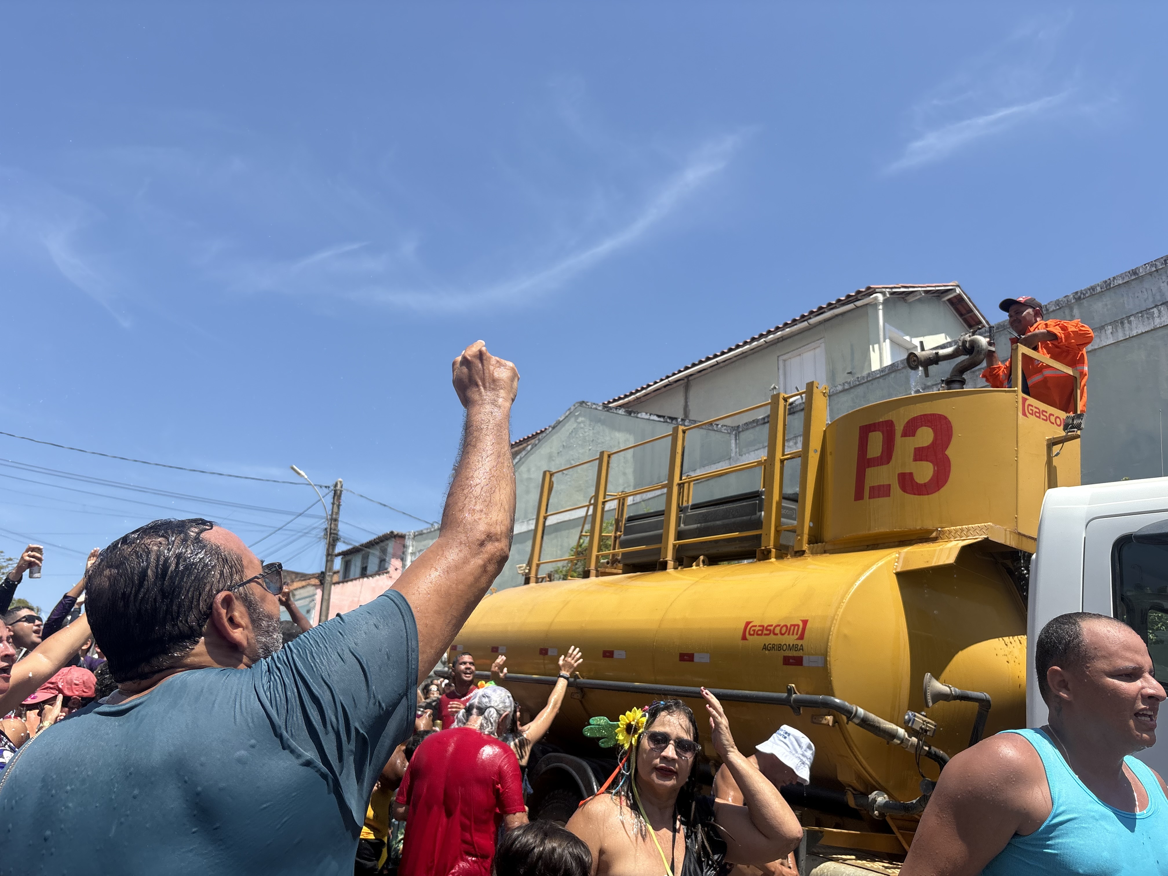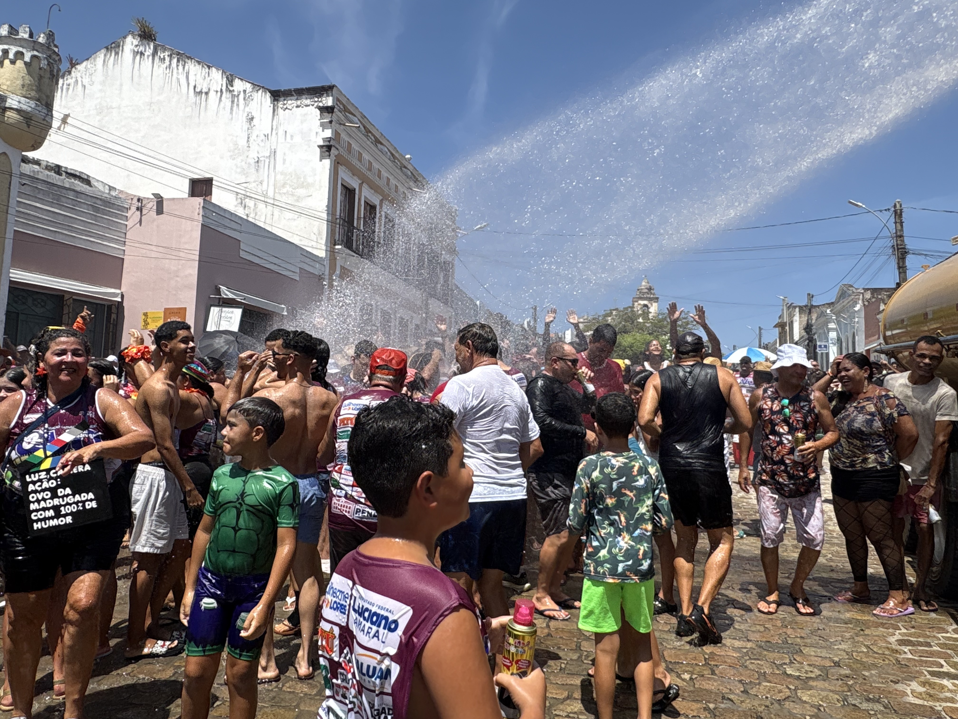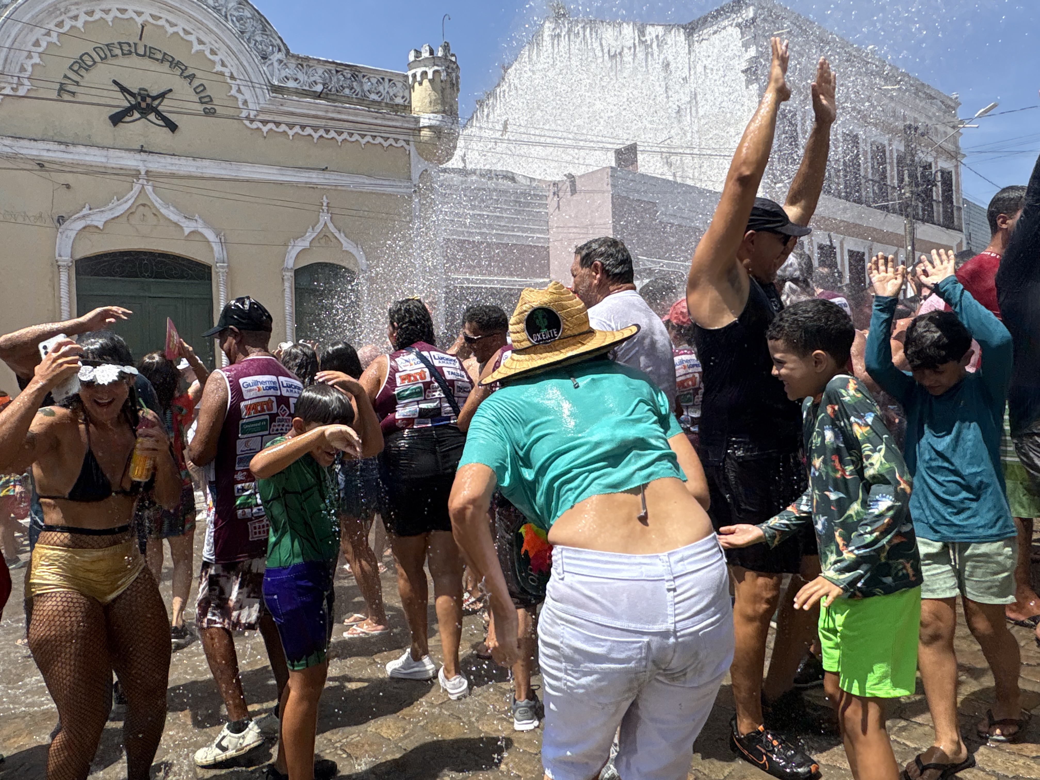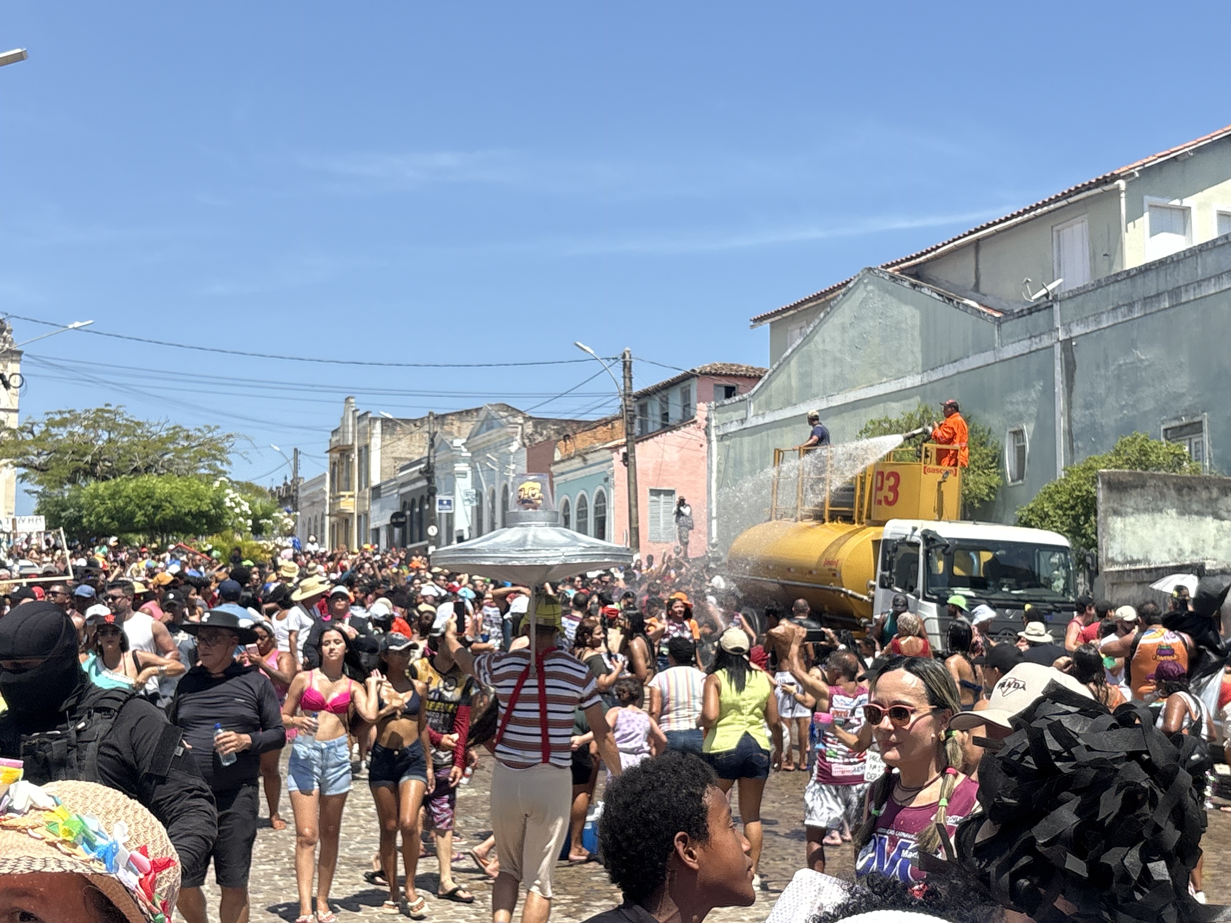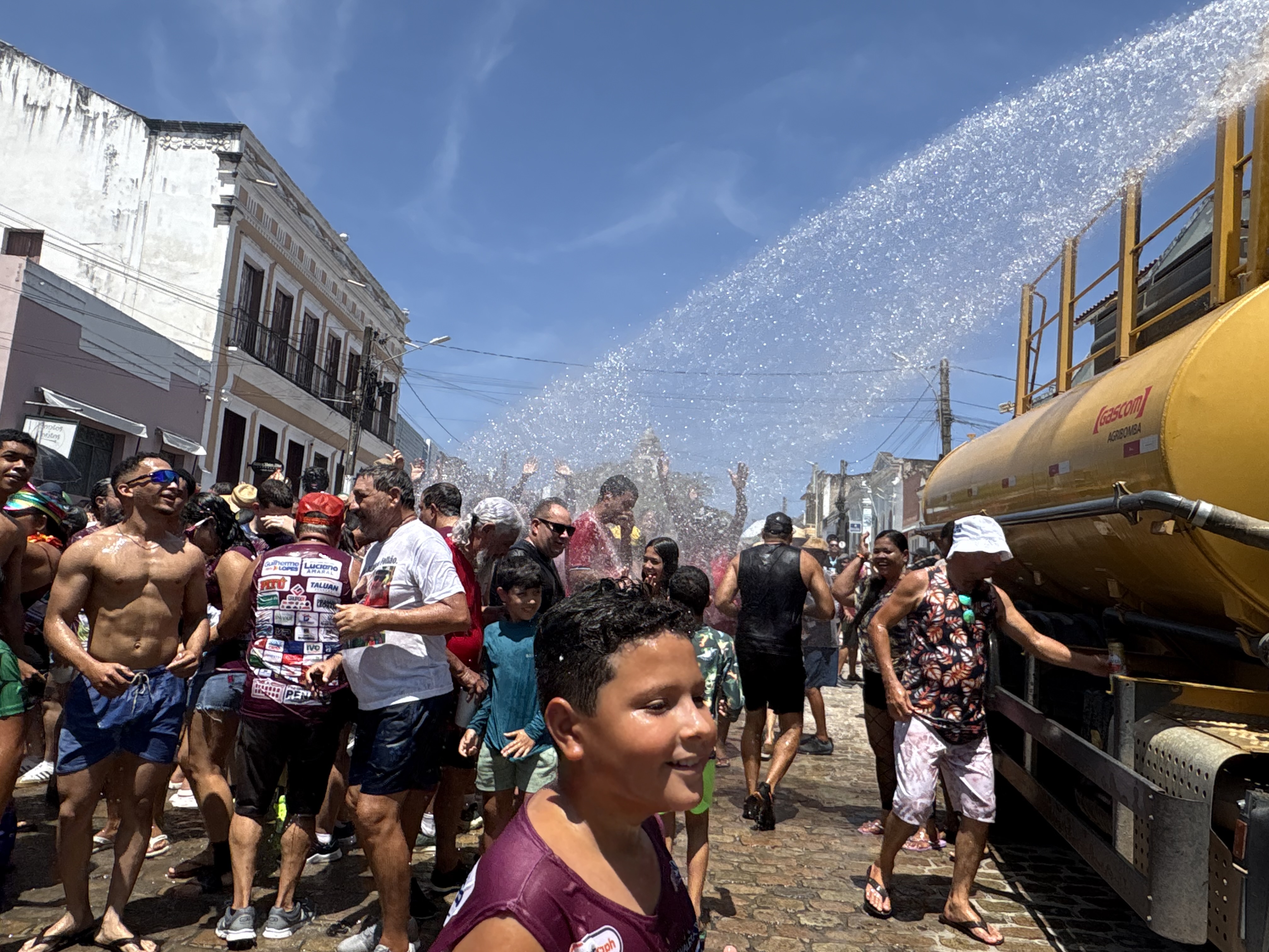 E em frente ao Cine Penedo, sala de exibição histórica inaugurada em 1950 que passou por restauração recente, aconteceu o tradicional banho de caminhão-pipa, para refrescar quem caminhava.