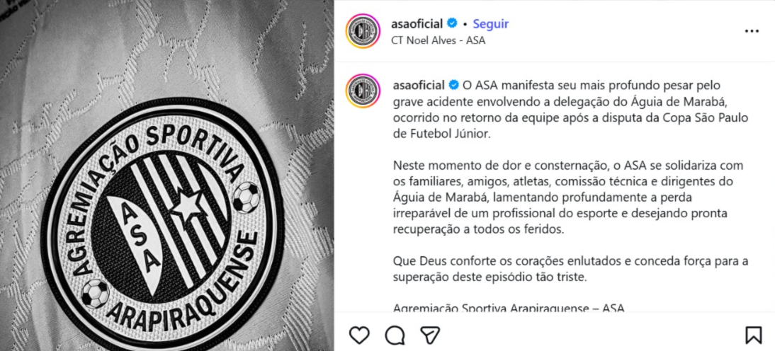 O ASA de Arapiraca, publicou em suas redes sociais uma imagem com um texto em que cita o ocorrido, lamenta a morte do preparador físico e se solidariza com o elenco do time paraense.