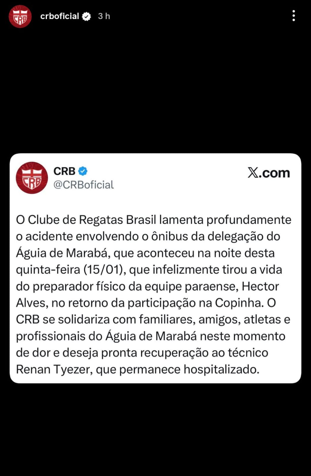 O CRB lançou nota, publicada nas redes sociais, lamentando o acidente, citando o técnico Renan Tyezer, que permanece hospitalizado em estado grave.