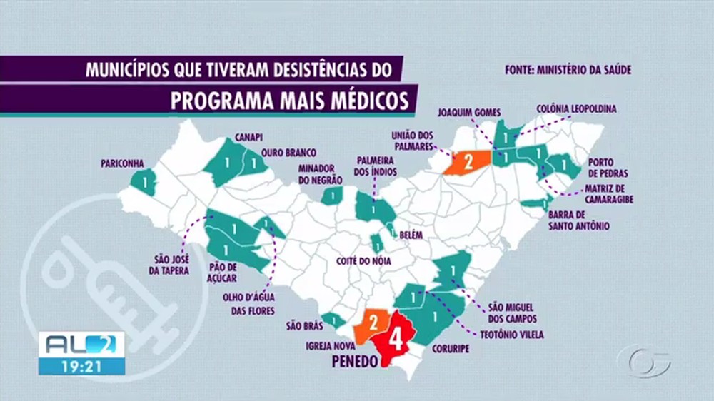 Um levantamento divulgado nesta quinta-feira (4) pelo Ministério da Saúde mostra que nos primeiros três meses do ano, 28 profissionais desistiram de participar do Programa Mais Médicos em 23 municípios de Alagoas. A maioria das desistências no estado foi no município de Penedo.