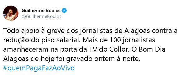 Guilherme Boulos, ex-candidato à Presidência da República, usou a rede social para prestar apoio aos jornalistas de Alagoas. "Todo apoio à greve dos jornalistas de Alagoas contra a redução do piso salarial. Mais de 100 jornalistas amanheceram na porta da TV do Collor. O Bom Dia Alagoas de hoje foi gravado ontem à noite. #quemPagaFazAoVivo", disse.