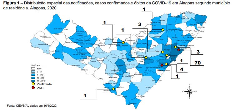 Entre suspeitos e confirmados, até essa quinta, foram notificados casos em 70 dos 102 municípios alagoanos, em todas as 10 regiões de saúde (RS) do Estado. No comparativo com o boletim da última quarta-feira (15), em um dia, mais 4 municípios notificaram casos do novo coronavírus.