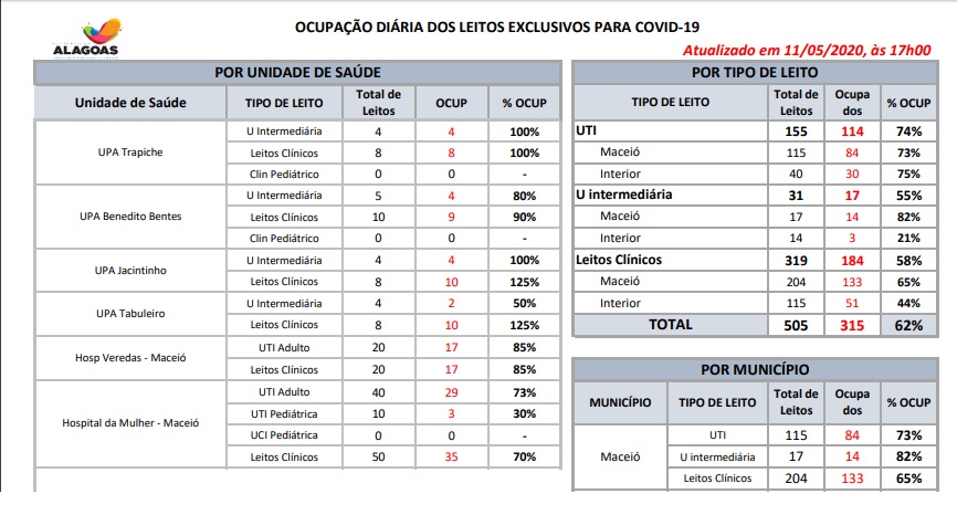 Em todo o Estado, segundo a Secretaria de Saúde de Alagoas existem hoje 505 leitos exclusivos para Covid-19 (um aumento de mais de 50 novos leitos em uma semana), sendo 155 UTIs, 31 Unidades Intermediárias e 319 leitos clínicos.