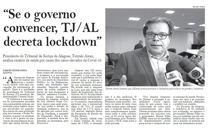 O Poder Judiciário pode decretar lockdown em Alagoas, desde que seja feito pedido pelo Poder Executivo, Ministério Público ou Defensoria Pública. O presidente do Tribunal de Justiça de Alagoas (TJ/AL), desembargador Tutmés Airan, disse em entrevista publicada pelo jornal Tribuna Independente, nesta terça-feira (12), que a decisão depende da pertinência da petição e do que determina a ciência