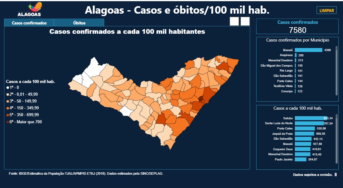 Com um total de 4.360, Maceió tem a maioria dos casos confirmados de Covid-19,o que representa 57,5% do total. Todas as outras 97cidades do interior tem 3.220 casos, o que representa 42,5% do total.