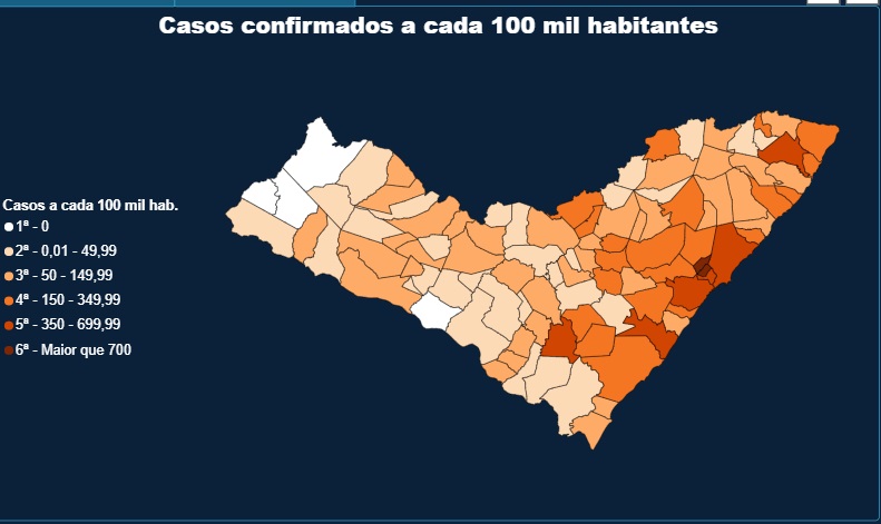 A região do sertão, de acordo com o mapa da Covid-19 segue como a menos afetada pela pandemia no Estado até o momento. A situação, no entanto, é de atenção. Num dos maiores municípios sertanejos, Santana do Ipanema, já foram registrados até o momento 62 casos (130 por 100 mil habitantes). Outras cidades, a exemplo de São José da Tapera, Olho d'Água das Flores já registram mais de 20 casos do novo coronavírus.