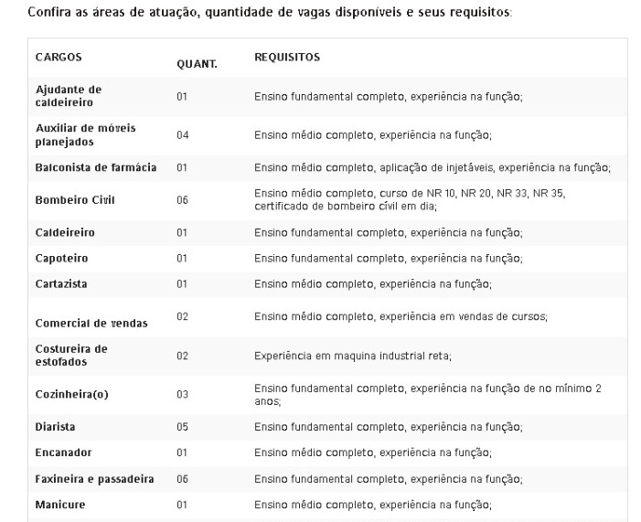 Os interessados devem enviar o currículo para o [email protected]. A vaga escolhida deverá estar no assunto do e-mail.