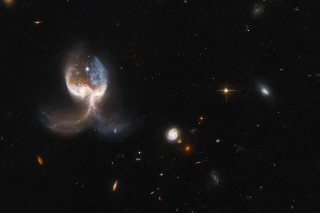 A cena captada pelo telescópio mostra colisão contínua entre duas galáxias distantes que formam "asas de anjo"