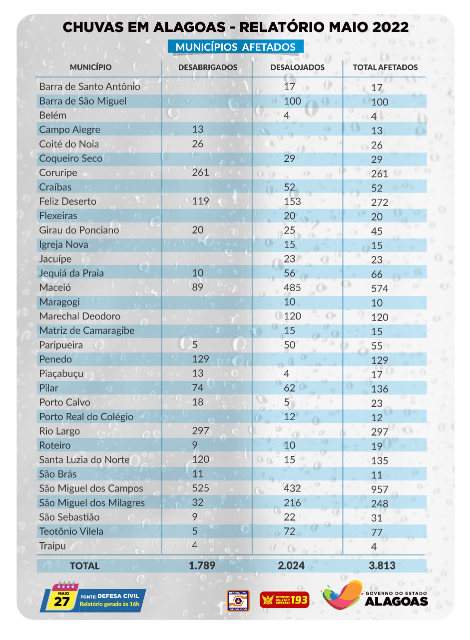 A Defesa Civil Estadual liberou e atualizou o boletim sobre o número de pessoas afetadas pelas fortes chuvas em Alagoas às 11h desta sexta-feira (27), informando que 3.813 pessoas foram afetadas diretamente ou indiretamente, em 33 municípios alagoanos. De acordo com a Defesa Civil Estadual, até esta sexta-feira havia 1.789 pessoas desabrigadas e 2.024 desalojadas.