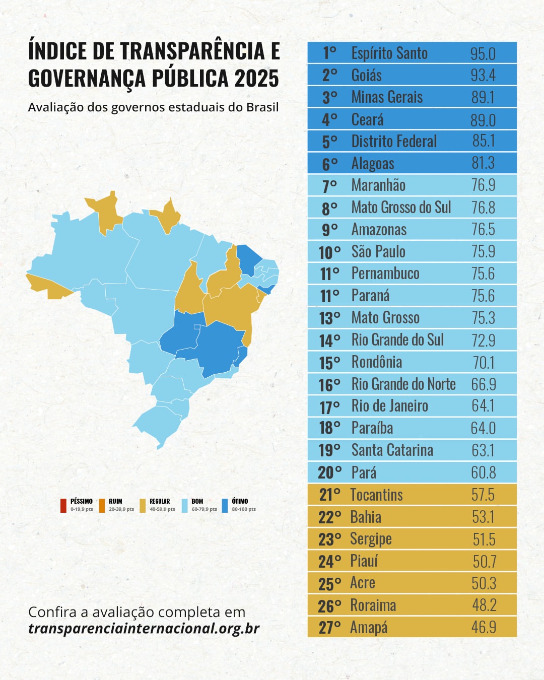 A informação foi divulgada nesta terça-feira (30) pela Transparência Internacional – Brasil, ONG responsável pela avaliação. O último levantamento aconteceu em 2022. O ranking pode ser acessado neste link.