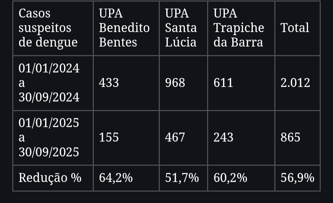 Entre janeiro e setembro de 2024, as unidades registraram 2.012 casos suspeitos de dengue. No mesmo período de 2025, esse número caiu para 865, o que representa uma redução de 56,9%