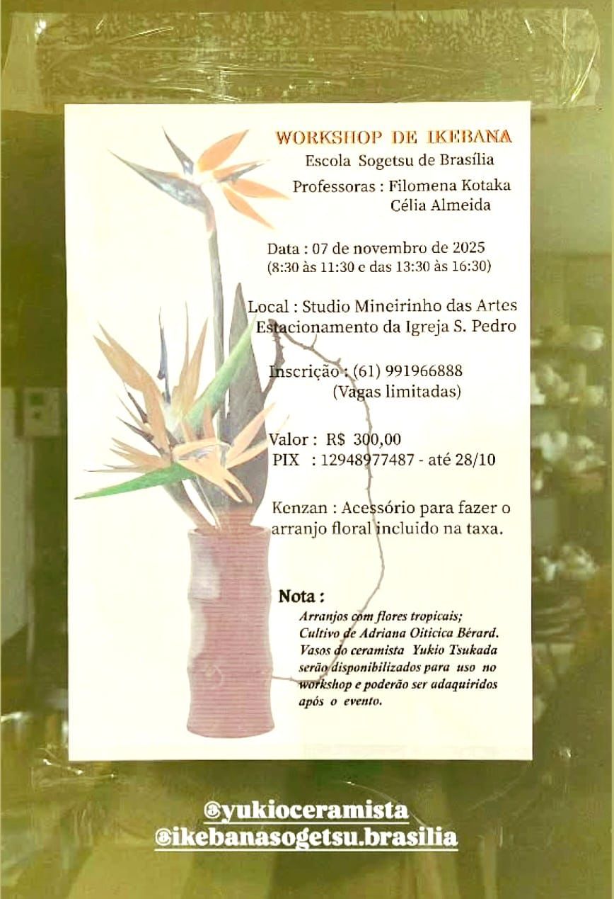 Maceió vai sediar, no dia 7 de novembro de 2025, um Workshop de Ikebana – Escola Sogetsu, ministrado pelas professoras Filomena Kotaka e Célia Almeida, reconhecidas especialistas na arte japonesa dos arranjos florais. O curso será realizado no Studio Mineirinho de Artes, localizado no estacionamento da Igreja São Pedro, na Rua Durval Guimarães, bairro Ponta Verde, com atividades nos turnos da manhã (8h30 às 11h30) e da tarde (13h30 às 16h30).