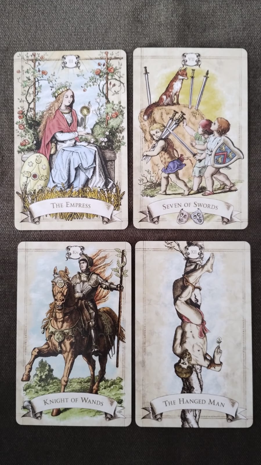 Para o Brasil, as cartas que saíram foi a Imperatriz e o Sete de Espadas. A carta da Imperatriz ela sempre vem falar sobre alegria, sucesso, prosperidade, fertilidade e o sete de espadas, ele fala sobre perdas, sobre subtrações, traições. Então, de um modo muito geral, eu entendo que o amor no Brasil vai estar em alta.