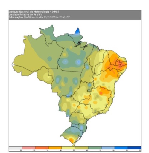 Dezembro de 2025 também trouxe baixos índices de umidade relativa do ar em diversas localidades do Brasil, incluindo Alagoas. Os níveis mais baixos foram registrados nas regiões Nordeste, Sudeste e Sul.