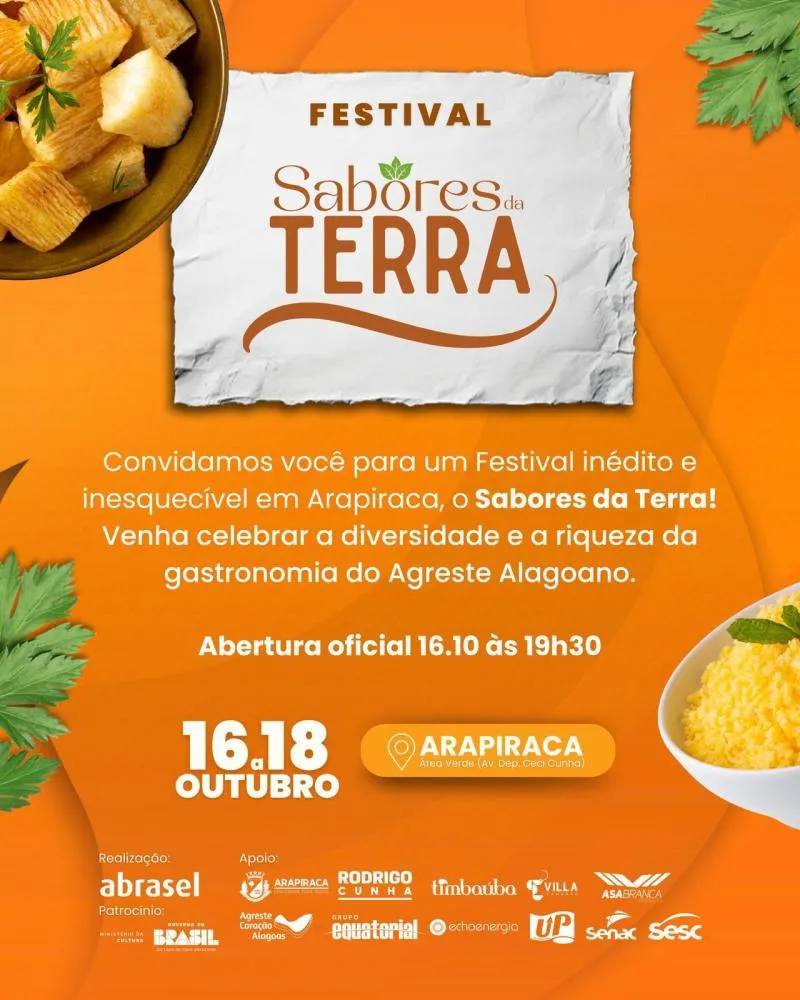O Festival Sabores da Terra começa nesta quinta-feira (16) e segue até sábado (18) na Área Verde de Arapiraca, espaço completamente revitalizado pelo prefeito Luciano Barbosa. O evento reúne gastronomia, música e atividades para toda a família.
