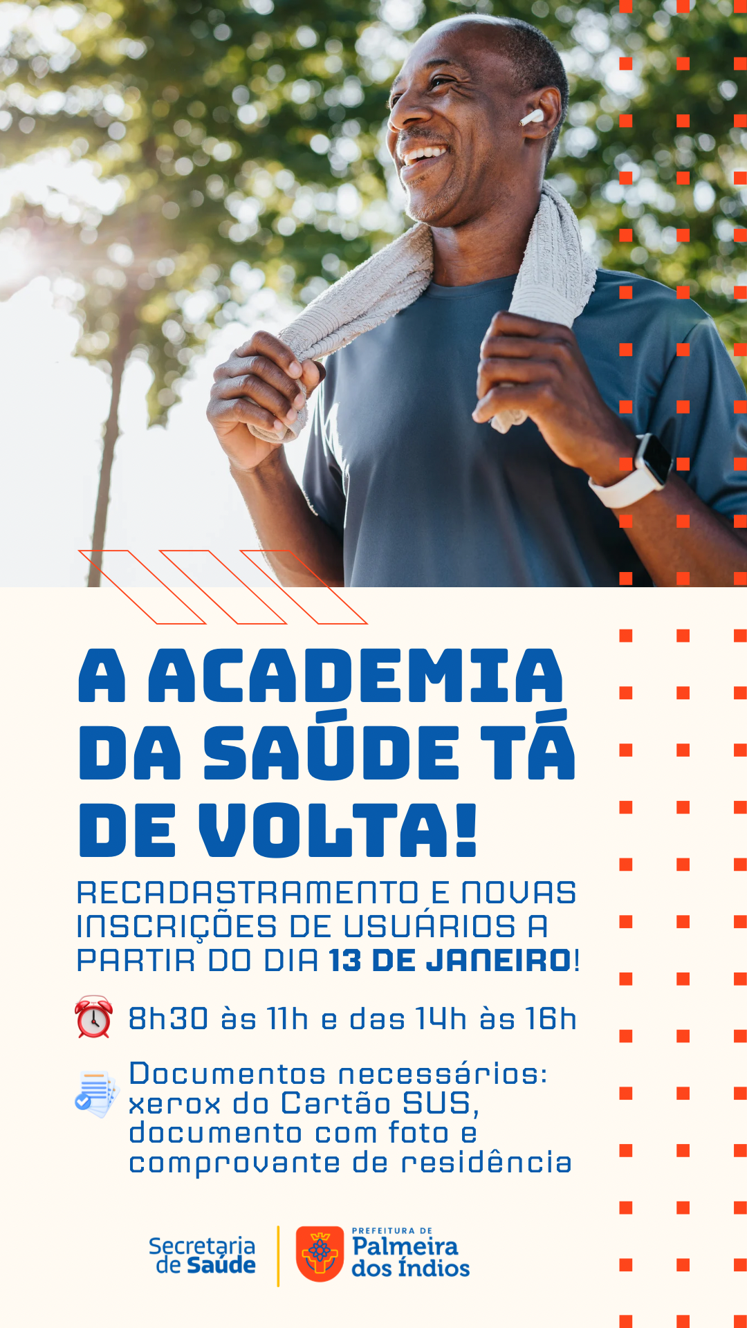 A Academia da Saúde é um programa do Ministério da Saúde, gerido pela Secretaria Municipal de Saúde, que tem como objetivo promover saúde e bem-estar. A iniciativa vai além da prática de exercícios físicos, contemplando também ações de alimentação saudável, educação em saúde, atividades culturais e artísticas, além da integração com as Unidades Básicas de Saúde (UBS), com foco no cuidado integral e na adoção de modos de vida mais saudáveis pela população.