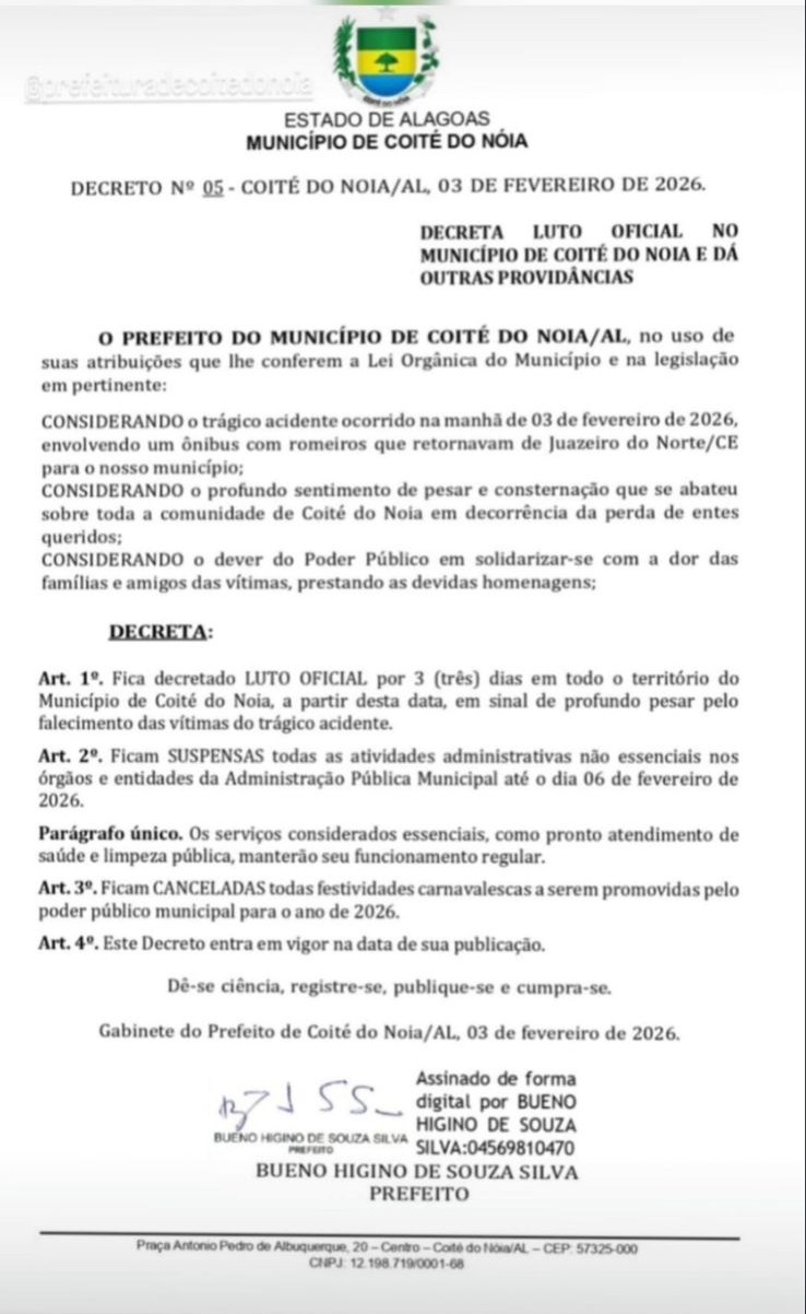 “Neste momento de dor imensurável, a Prefeitura de Coité do Noia se solidariza com as famílias e amigos das vítimas, colocando-se inteira à disposição para o que for necessário. Decretamos luto oficial no município como sinal de nosso profundo respeito e tristeza”, afirmou a prefeitura de Coité do Noia por meio de nota divulgada nesta terça (03).