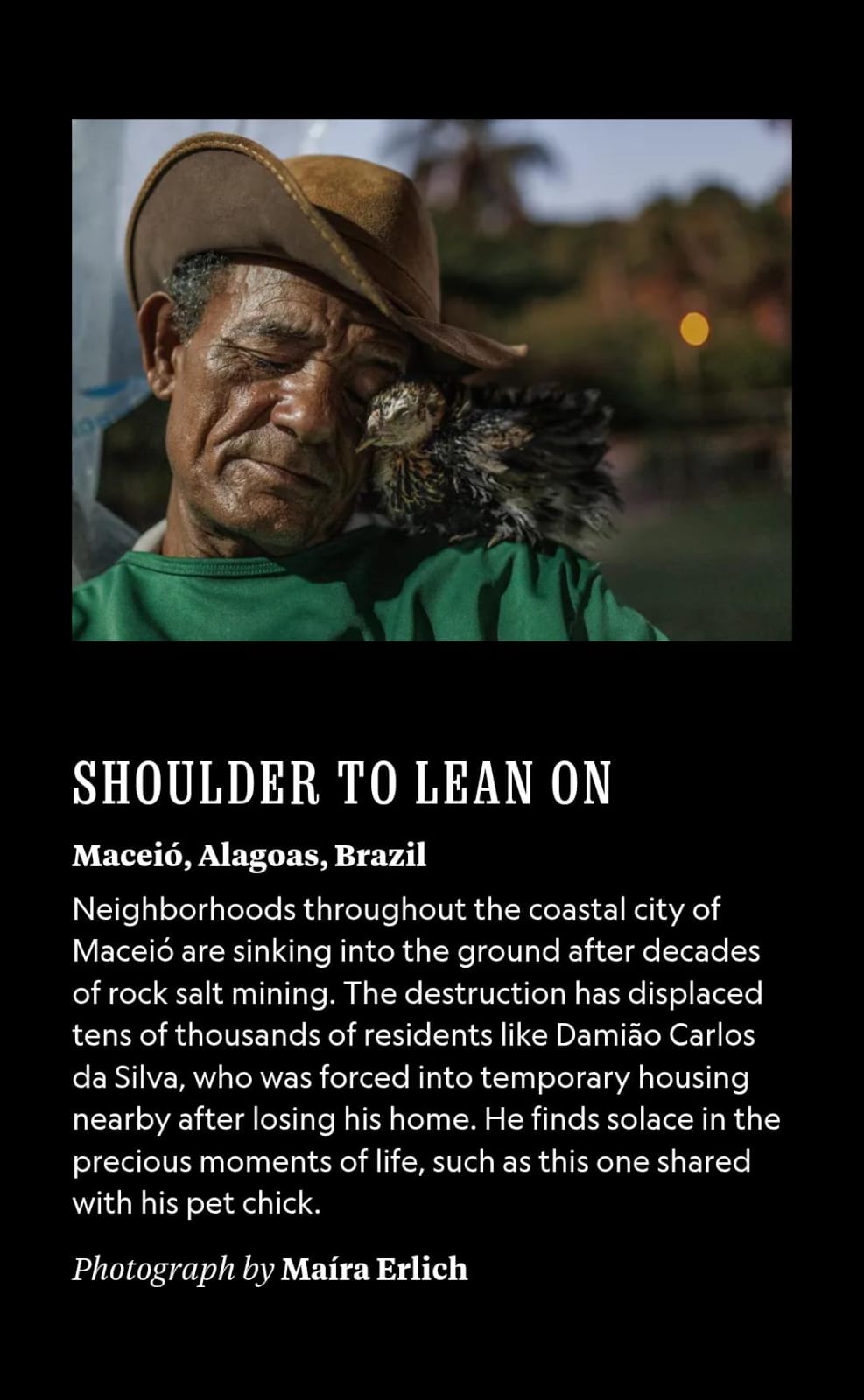Essa mesma imagem, intitulada "Shoulder to lean on" (Ombro para se apoiar), foi selecionada como uma das 25 melhores fotos do mundo pela revista Internacional National Geographic, um dos maiores periódicos que reúne fotografia e reportagens aprofundadas sobre temas variados de cultura, arte, geografia, etnografia, história e culturas globais.