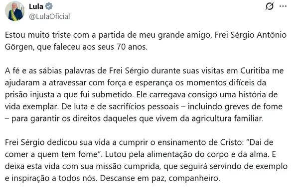O presidente Luiz Inácio Lula da Silva (PT) lamentou a morte de Frei Sérgio, a quem definiu como grande amigo, e destacou a trajetória do religioso, marcada por luta e sacrifícios pessoais.