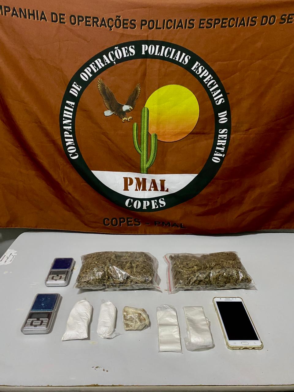 Por volta das 22h de sexta-feira (17), na cidade de Mata Grande, um homem de 53 anos foi preso por tráfico de drogas pela Companhia Independente de Operações Policiais Especiais do Sertão (Copes). O quantitativo apreendido nesta ação soma-se aos entorpecentes retirados das ruas durante a semana. Com o indivíduo preso, foram recolhidos: 330 gramas de maconha, 58,5 gramas de crack e 80,6 gramas de cocaína, além de duas balanças de precisão, várias embalagens plásticas e um aparelho celular.