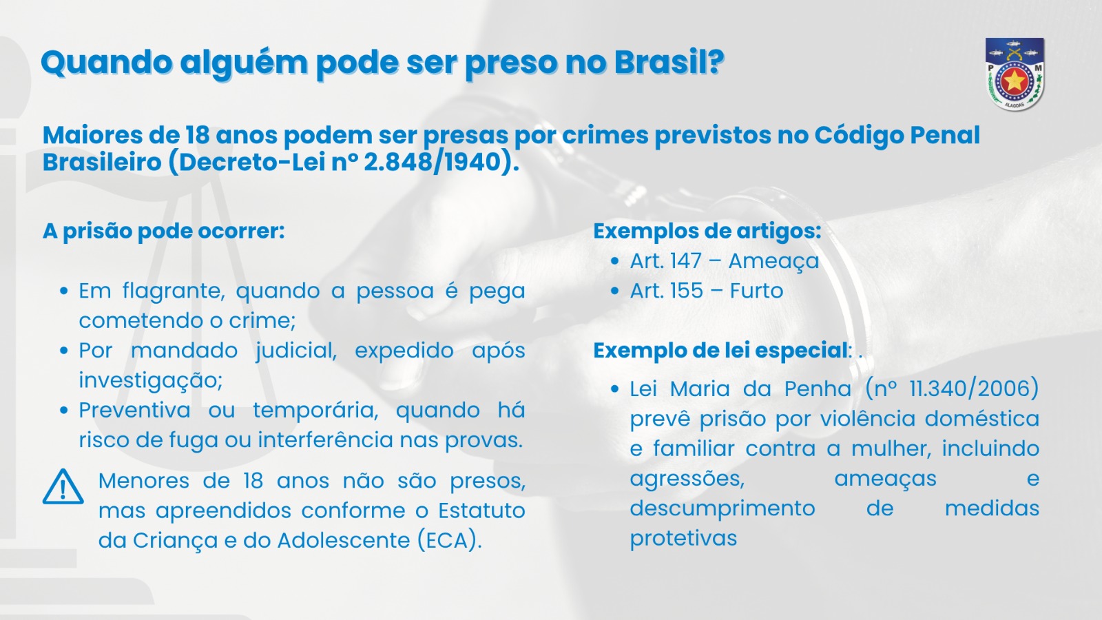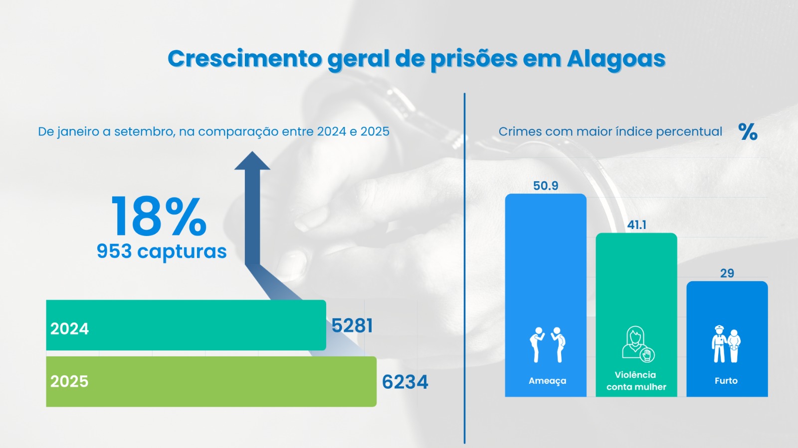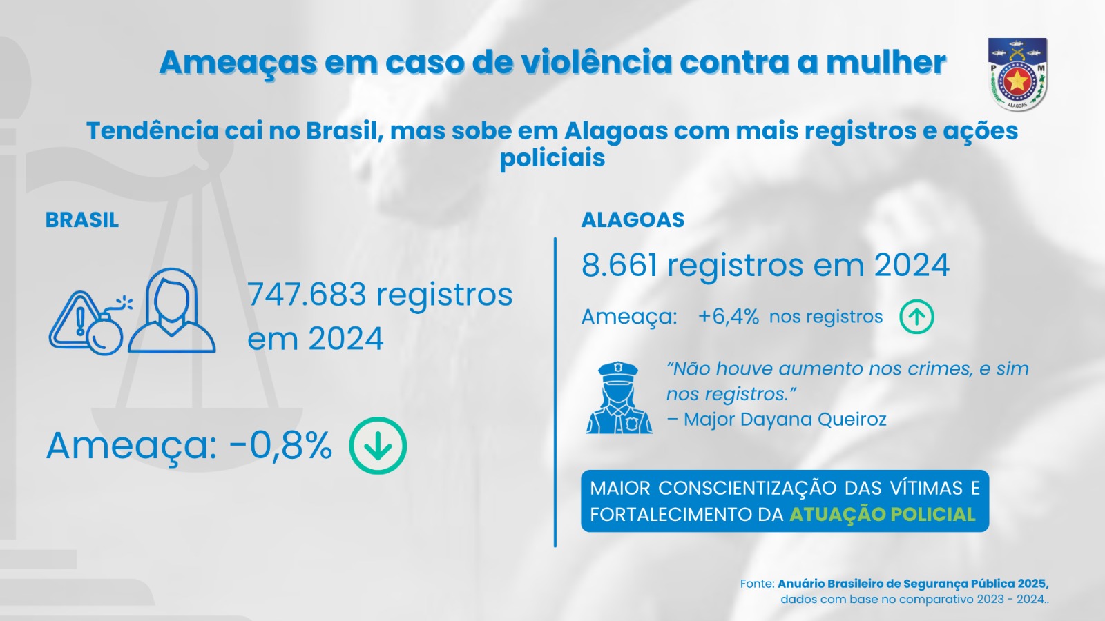 O caso ilustra uma tendência estadual: o aumento das prisões efetuadas pela Polícia Militar de Alagoas (PM/AL). Entre janeiro e setembro de 2025, foram 6.234 prisões — 953 a mais que no mesmo período do ano anterior, o que representa um crescimento de 18%. Os crimes com maior frequência de prisões incluem ameaça (50,9%), violência contra a mulher (41,1%) e furto (29%), segundo dados da Seção de Estatística e Ciência Aplicada da corporação.
