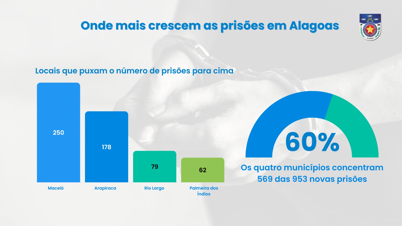 Os municípios de Palmeira dos Índios, Rio Largo e Arapiraca apresentaram crescimento acima de 50% nas prisões, enquanto Maceió, mesmo com alta de 12%, manteve a liderança, com 2.327 capturas — 250 a mais que em 2024. Juntas, essas quatro cidades concentram 569 das novas prisões.