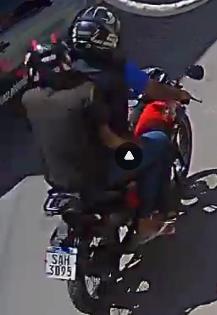 Dois homens em uma moto da cor vermelha passam pela mulher. Um deles, que está no lugar do passageiro, pula rapidamente do veículo, vai até a mulher e pega o celular dela. Na cena, não é possível ver que o suspeito está armado. Os dois criminosos estavam com capacetes.