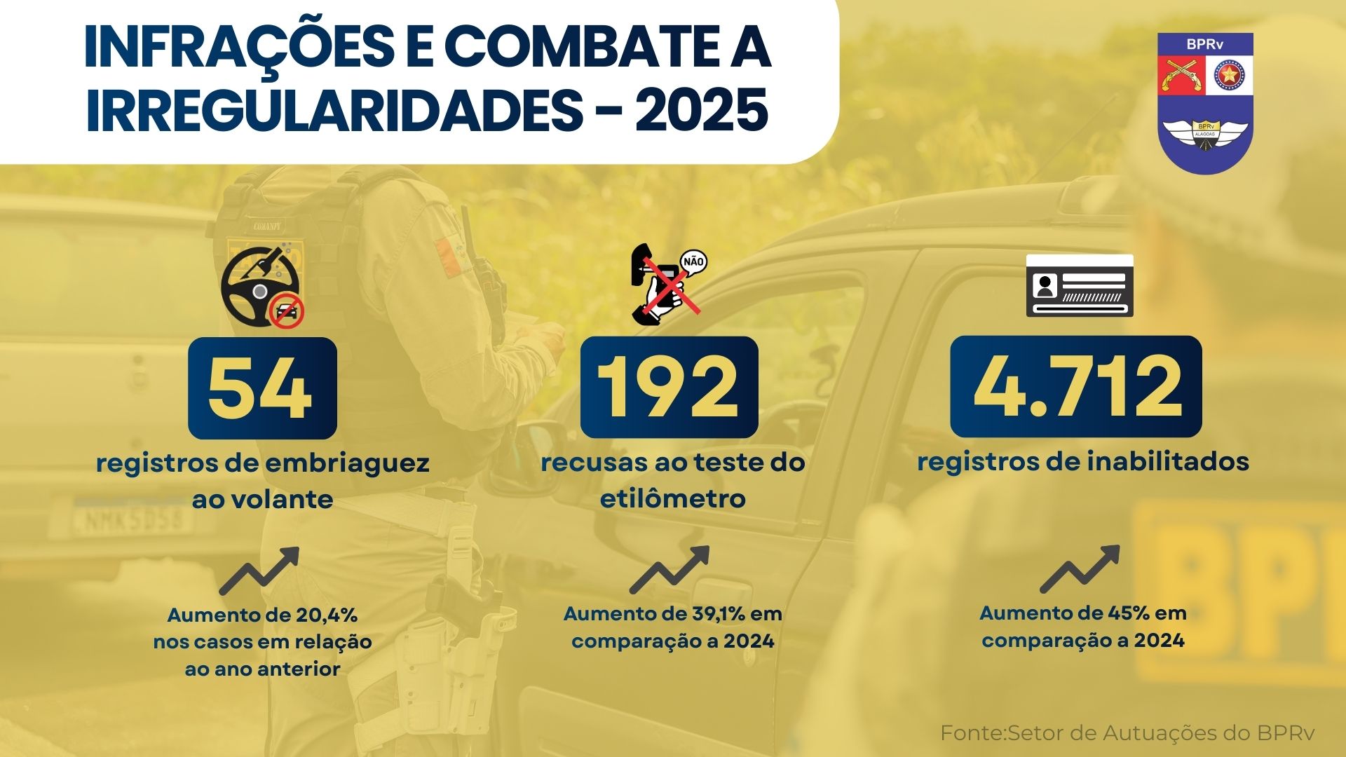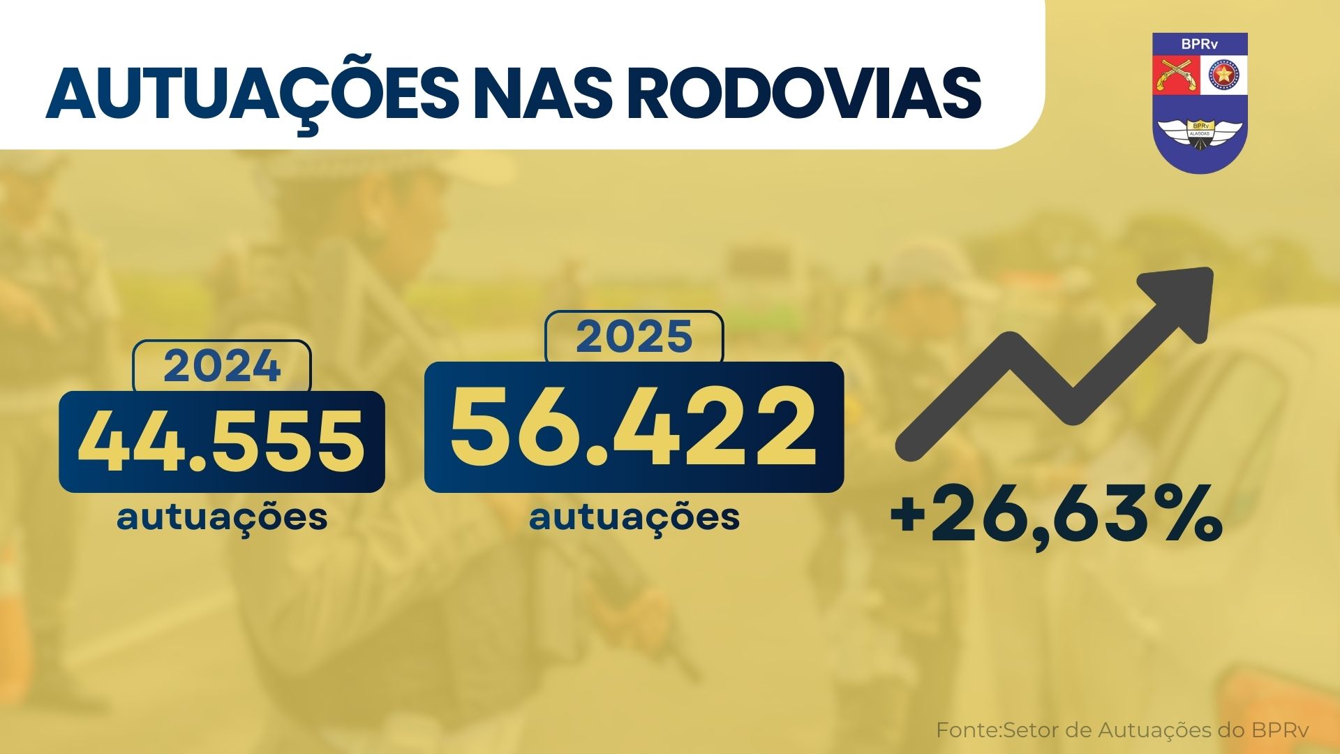 Ao longo de 2025, o BPRv registrou 56.422 autuações de trânsito. O mês de outubro concentrou o maior volume, com 5.616 infrações. O total anual representa um crescimento de 26,63% em relação a 2024, quando foram registradas 44.555 autuações. Já em 2026, até o dia 12 de janeiro, a unidade contabilizou 2.142 registros.