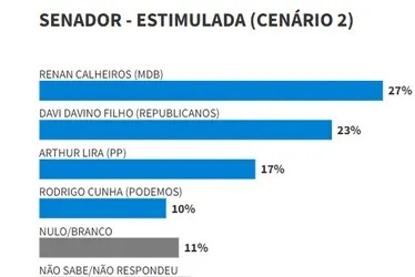Cenário 2 (sem JHC): Renan Calheiros (27%), David Davino Filho (23%), Arthur Lira (17%) e Rodrigo Cunha (Pode, 10%).