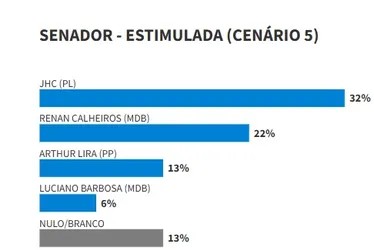 Cenário 6 (com JHC): JHC (32%), Renan Calheiros (22%), Arthur Lira (13%) e Luciano Barbosa (6%)