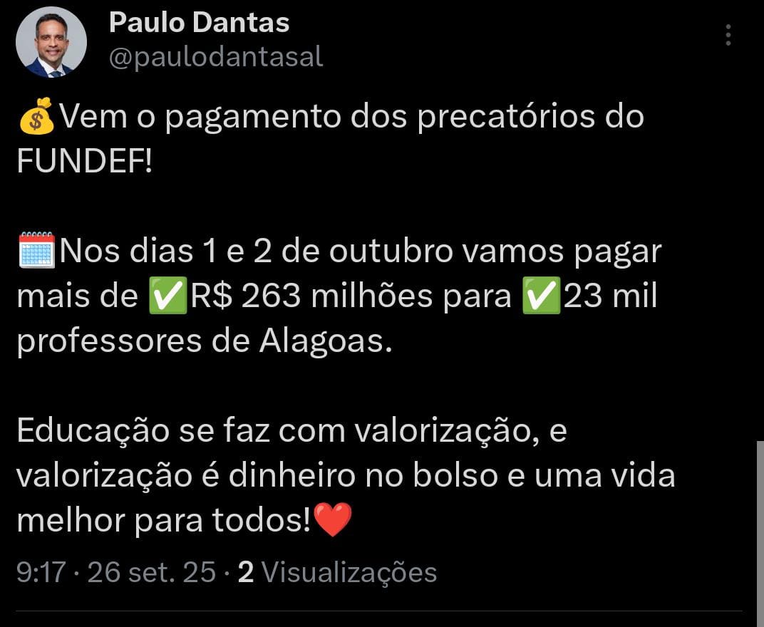 Segundo a publicação, o Estado vai pagar, nos dias 1º e 2 de outubro, mais de R$ 263 milhões referentes aos precatórios do Fundef a 23 mil professores de Alagoas.