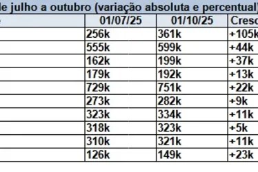 Quem mais cresceu de julho a outubro (variação absoluta e percentual):