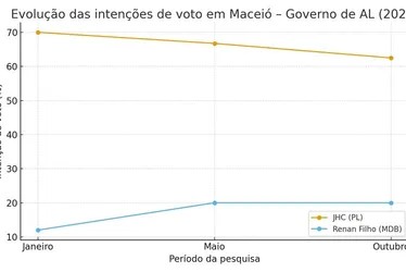 Desde o início de 2025, de acordo com o Falpe, a diferença acumulada entre Renan Filho e João Henrique Caldas caiu 15 pontos percentuais, apontando para uma tendência que, se mantida, poderá dificultar uma eventual candidatura de JHC em 2026. o prefeito teria que renunciar a quase três anos de mandato, correndo o risco de “perder tudo”, numa disputa com o ministro dos Transportes.