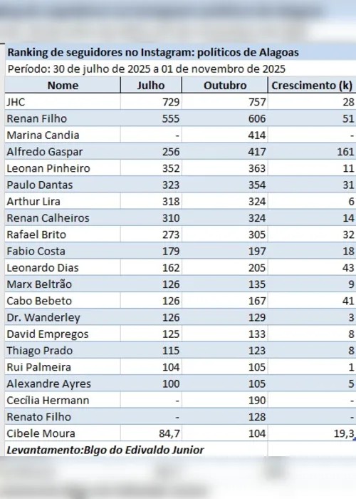 A política alagoana vive, nas redes, uma corrida tão intensa quanto nas ruas. O mais recente levantamento do Blog do Edivaldo Junior sobre seguidores no Instagram — plataforma que hoje dita tendências, pauta debates e influencia o voto — mostra um mês de forte movimentação no topo do ranking estadual.
