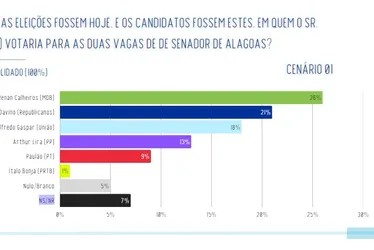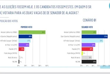 A pesquisa reforça ainda que, apesar de a disputa pela segunda vaga permanecer embolada, com variação dentro da margem de erro entre Davi Davino e Alfredo Gaspar, Renan Calheiros está isolado no topo. Seu nome aparece sempre acima dos demais concorrentes, seja no voto espontâneo, no primeiro voto ou no acumulado.