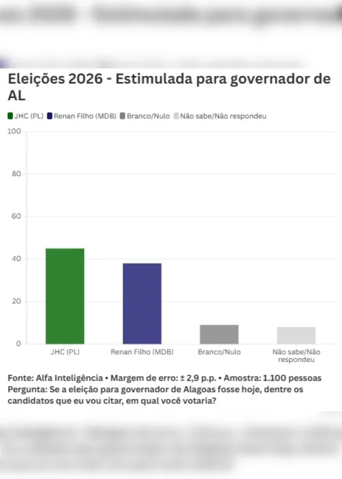 Nova pesquisa do Alfa Inteligência revela um cenário diferente para as eleições de 2026 em Alagoas: o prefeito de Maceió, João Henrique Caldas (JHC-PL) lidera a disputa pelo governo com 45% das intenções de voto, contra 38% do ministro dos Transportes, Renan Filho (MDB).
