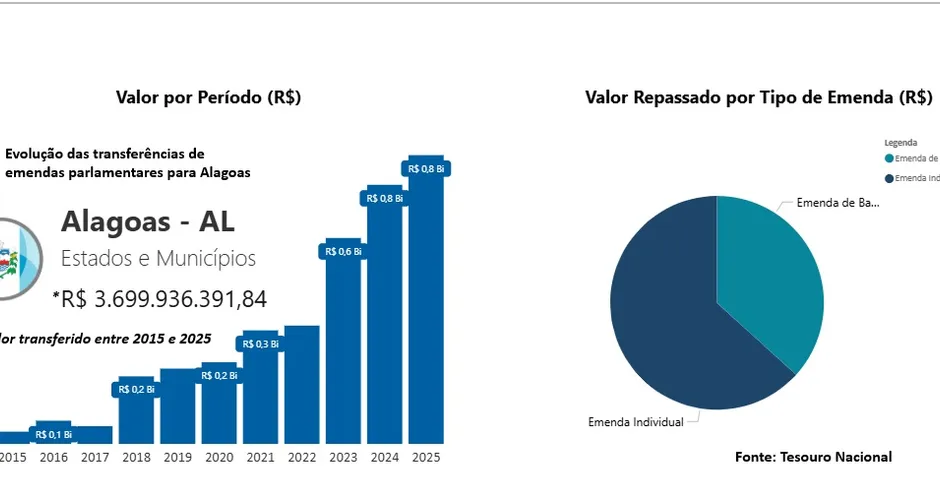O volume de emendas parlamentares impositivas transferidas para Alagoas e seus municípios revela uma mudança estrutural no peso político de deputados federais e senadores. De acordo com dados oficiais do Tesouro Nacional, em 2015, o estado recebeu pouco mais de R$ 35 milhões em emendas individuais. Em 2025, o total já alcança R$ 845,7 milhões, considerando emendas individuais e de bancada — um crescimento superior a 2.200% em uma década.