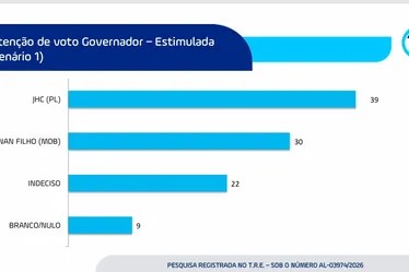 O resultado da pesquisa no cenário estimulado com dois candidatos aponta para uma liderança do prefeito de Maceió, João Henrique Caldas, o JHC (PL) contra o ministro dos Transportes, Renan Filho (MDB).