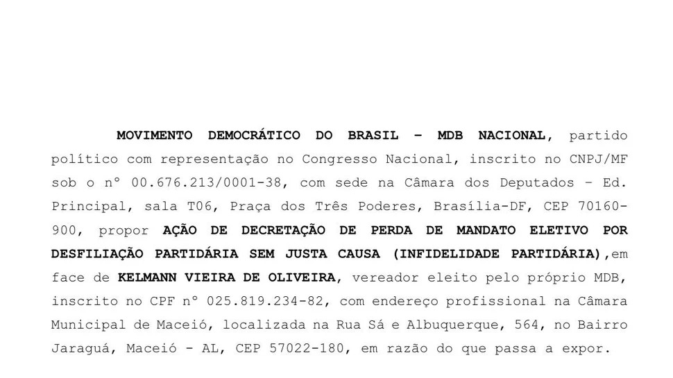 O diretório nacional do MDB protocolou, nesta terça-feira(14), uma ação na Justiça Eleitoral pedindo a perda do mandato do vereador por Maceió Kelmann Vieira.