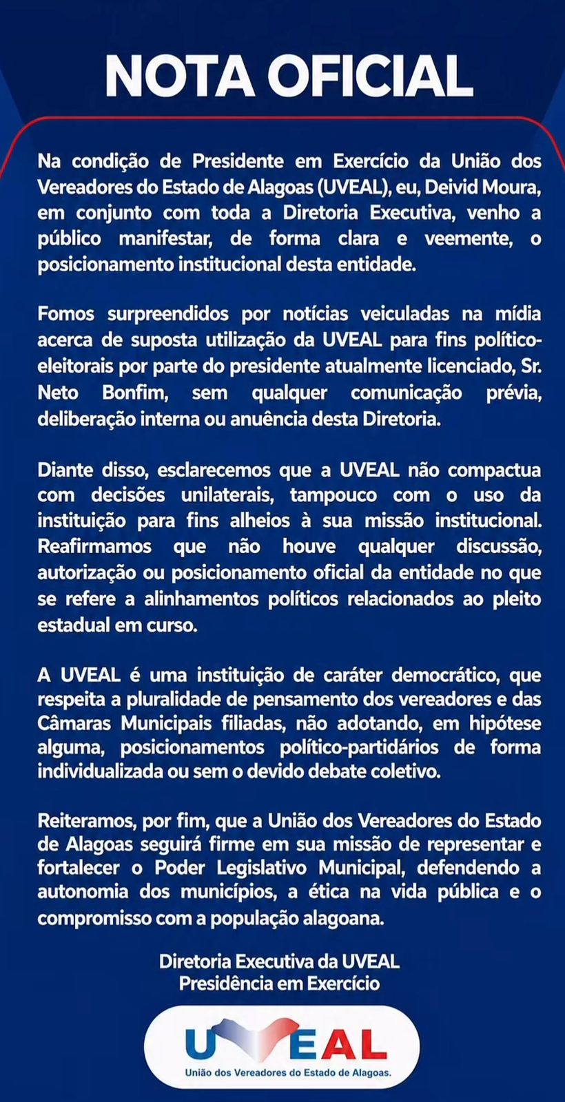 O posicionamento foi assinado pelo presidente em exercício da UVEAL, Deivid Moura, em conjunto com a Diretoria Executiva da instituição.