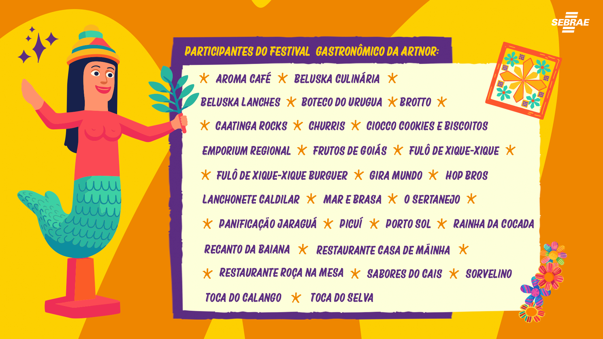 Entre os participantes estão estabelecimentos tradicionais e chefs que apostam em releituras criativas da culinária local. A Panificação Jaraguá, fundada em 1970, preparou um baião de dois com castanha de caju em homenagem ao artesão Caju Queimado, da cidade de Cajueiro.